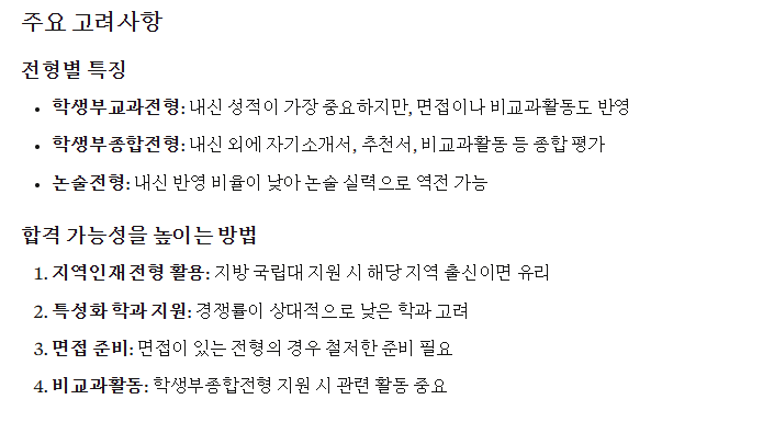 - 수능 최저학력기준 검토: 교과 및 논술 전형에서 수능 최저 기준 충족 가능성을 신중하게 검토해야 해요.