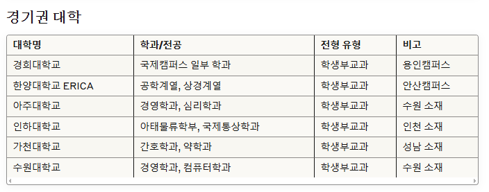 - 학생부종합전형: 내신 외 비교과 활동, 자기소개서, 면접 등을 종합 평가해요. 가천대, 삼육대, 서경대, 명지대, 수원대, 상명대, 을지대, 한성대, 경기대 등에서 강점을 보이는 학생들에게 유리해요.