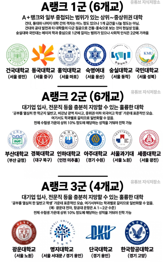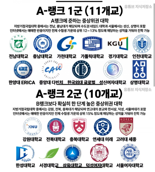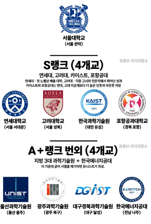 전반적인 대학 서열을 정리하면 다음과 같습니다.