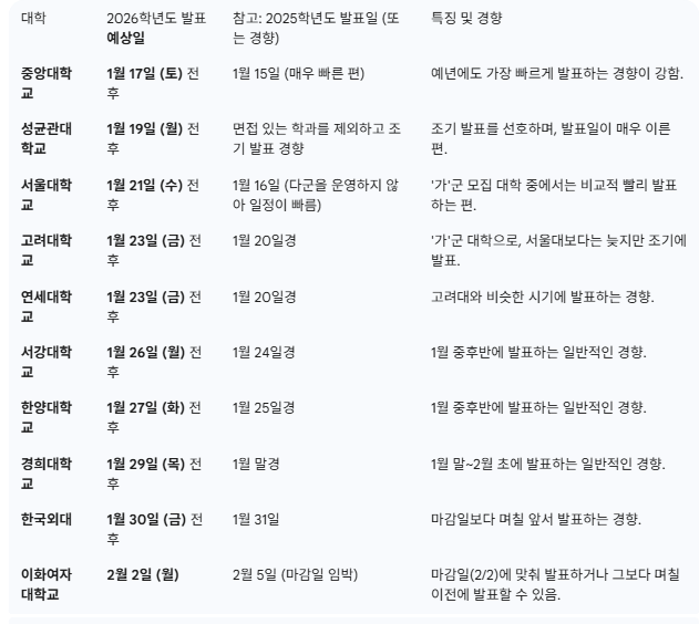 A. 2026년 2월 5일(수)까지입니다. 대부분 대학이 2월 1일~5일 사이에 발표하며, 정확한 날짜와 시간은 1월 말에 각 대학 입학처에서 공지합니다.