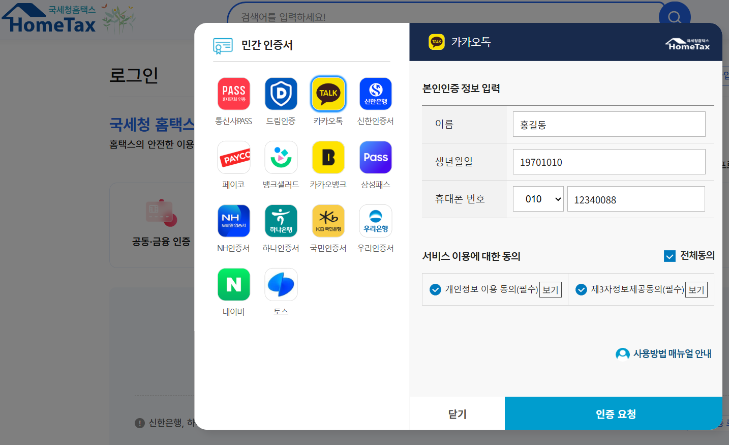 공동인증서, 금융인증서, 카카오 인증 등을 통해 로그인합니다.